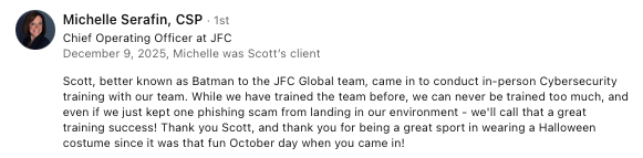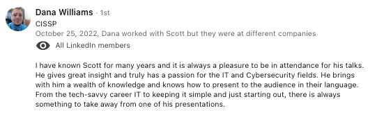 Scott also specializes in helping MSPs, MSSPs, and IT teams break through growth barriers by building internal expertise, increasing service quality, and driving stronger client outcomes. His sessions are tailored to meet the unique needs of your team, whether it’s team-building exercises, customer-service-first mentoring, or executive-level guidance for vCIO/vCISO programs and support operations. With Scott, your event isn’t just a presentation—it’s an opportunity to elevate your people, your processes, and your organization’s cyber culture to the next level.