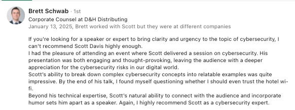 Bring expert insight, engaging storytelling, and real-world experience to your next event with Scott R. Davis. Whether you’re looking to strengthen your team’s cybersecurity awareness, energize a conference audience, or provide hands-on mentorship for IT and support staff, Scott delivers dynamic, interactive sessions that resonate with employees and leaders alike. From relatable, practical examples to actionable takeaways, his presentations ensure every attendee leaves with skills and strategies they can immediately apply to protect data, improve technology use, and enhance the culture of cybersecurity within your organization.